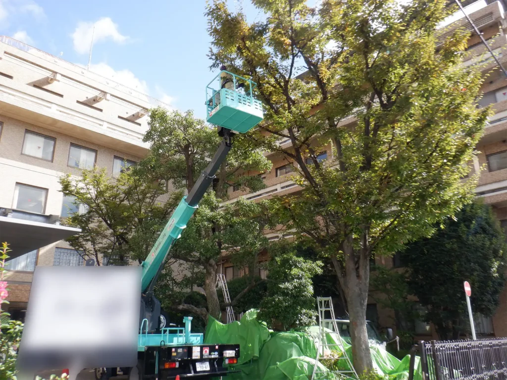 高所作業車で作業位置まで上昇。熟練の作業員が、周囲の安全を確認しながら丁寧に剪定を進めます。不要な枝を的確に除去していきます。