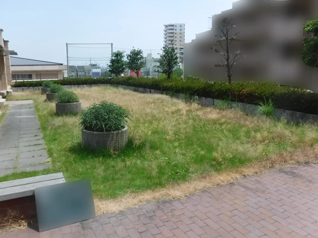 伸びすぎた芝生が不均一に生育し、雑草も混じり合う状態に。全体的に黄ばみも見られ、美観を損ねるだけでなく、芝自体の健康状態も低下していました。